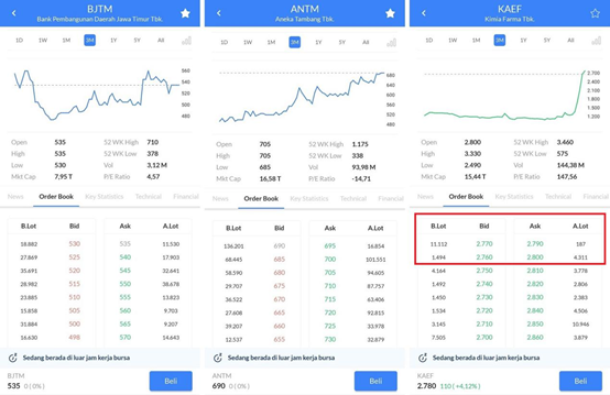 Umpama investor A menjual 30 lot saham Kimia Farma (KAEF) pada tingkat harga 2.790. Harga tersebut akan masuk ke dalam baris ask pada order book. Karena sudah ada orang lain yang menjual 187 lot saham KAEF pada tingkat harga yang sama, maka 30 lot saham yang ditawarkan oleh investor A akan meningkatkan jumlah ask lot pada order book menjadi 217. Order jual investor A akan “antri” di belakang orang lain yang sudah lebih dulu menjual saham KAEF pada tingkat harga 2.790 itu.