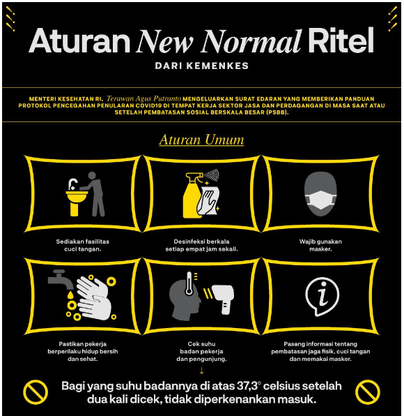 Protokol tersebut ditandai dengan keluarnya Surat Edaran (SE) dari Menteri Kesehatan Terawan Agus Putranto, yakni SE Nomor HK.02.01/Menkes/335/2020 tentang Protokol Pencegahan Penularan Corona Virus Disease (Covid-19) di Tempat Kerja Sektor Jasa dan Perdagangan (Area Publik) dalam Mendukung Keberlangsungan Usaha pada Rabu (20/5).