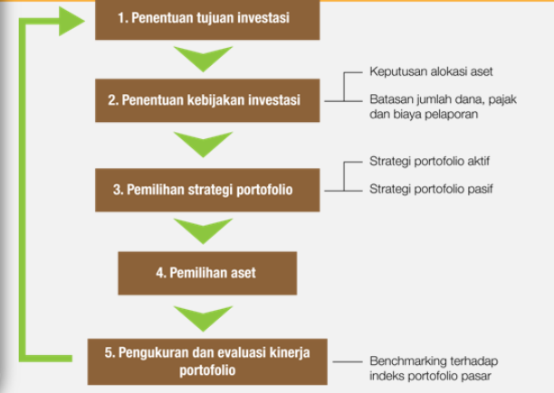 Ada 5 tahapan dalam proses pengambilan keputusan dalam berinvestasi, kelimanya merupakan proses yang berkesinambungan (on going). Jika sampai tahap ke-5 hasilnya masih belum sesuai ekspektasi, maka prosesnya akan diulang kembali sampai ditemukan strategi yang optimal.