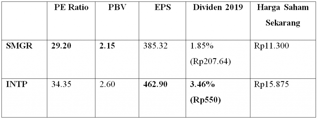 Alhasil, kemerosotan harga saham INTP selama tahun lalu bahkan lebih drastis ketimbang SMGR. Setelah sempat mencapai harga lebih dari Rp22000 per lembar pada bulan Juli-Agustus 2019, harga saham INTP merosot hingga Rp15875 dalam hari perdagangan terakhir (24 Februari 2020). Padahal, tahun lalu INTP berani membagikan dividen lebih besar dibanding rivalnya tersebut.