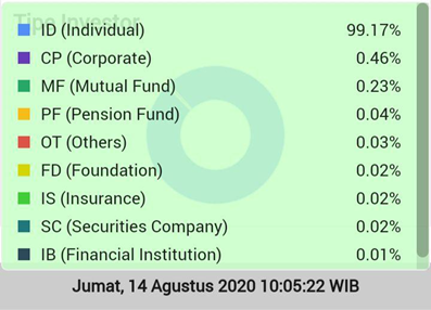 Sedangkan investor ritel adalah investor perorangan yang mengelola dana miliknya sendiri[2], seperti kita. Jumlah investor individu atau ritel mendominasi pasar modal. Sisanya adalah investor institusional. Kamu bisa lihat statistiknya di bawah ini;