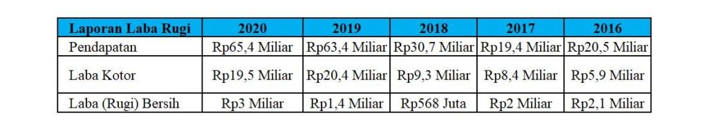 Emiten yang baru IPO pada 2019 ini, mencetak pendapatan pada 2016 sebesar Rp20,5 miliar dan kemudian mencapai Rp65,4 miliar pada 2020. Laba bruto pada 2017 sebesar Rp8,4 miliar dan mencapai Rp19,5 miliar pada 2020.
