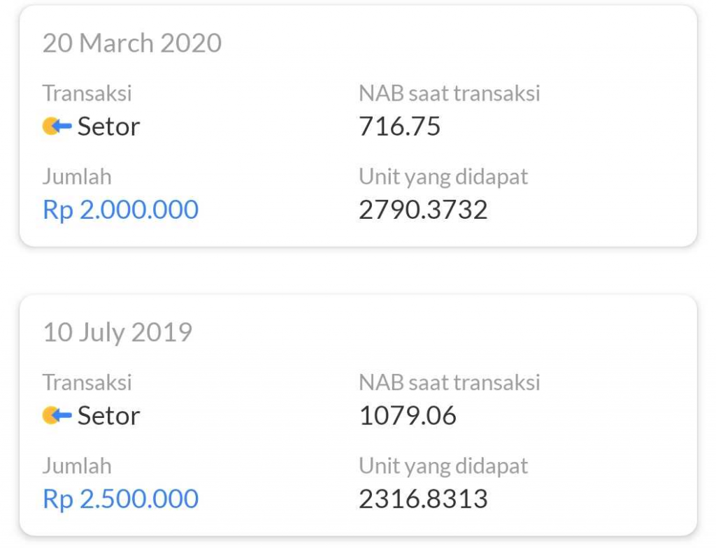 Ini adalah daftar transaksi dari salah satu investor Ajaib, Maya. Ia pertama kali setor Rp2.500.000 pada NAB 1079,06. Jika harga saat ini adalah 716,75, maka return Maya negatif nyaris 30%. Melihat hal ini, Maya setor (top-up) lagi sebesar Rp2.000.000. Jadilah Maya mendapatkan unit reksa dana yang lebih banyak, dengan harga lebih murah.