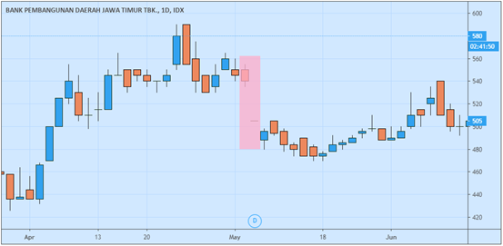 Dengan data-data seperti itu, saham BJTM tentu sangat menggiurkan untuk dikoleksi oleh pemburu dividen. Minat beli saham BJTM semakin meningkat jelang cum date, hingga harganya menanjak dari kisaran Rp440-an menjadi Rp580-an dalam kurun waktu tersebut. Tapi, tahukah kamu, apa yang terjadi sehari setelah cum date? Harga saham BJTM anjlok sedemikian rupa hingga tercipta gap (celah) yang cukup lebar pada grafik candlestick.