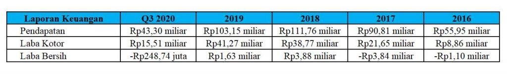 Hal itu tercermin dari pendapatan hingga September 2020 sebesar Rp43,30 miliar atau merosot 33% secara tahunan (yoy) dibandingkan periode sama tahun sebelumnya yaitu Rp64,67 miliar.