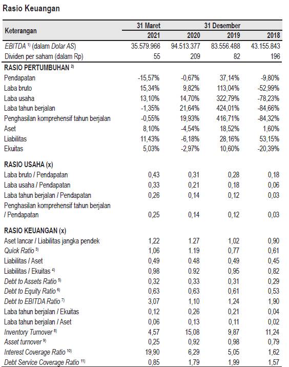 Untuk mendapatkan gambaran lebih jelas tentang apakah suatu saham layak dibeli, lazimnya kita perlu meninjau rasio-rasio keuangan. Berikut ini status rasio keuangan MCOL selama tiga tahun terakhir dan kuartal I/2021: