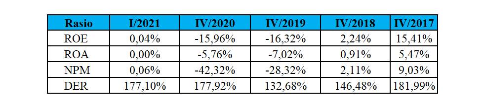 Bagaimana dengan rasio-rasio keuangan TOPS dari tahun ke tahun? Berikut ini perbandingan kinerja keuangan TOPS sejak kuartal terakhir 2017 hingga kuartal pertama 2021:
