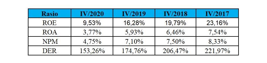 Beberapa rasio di atas menunjukkan bahwa kemampuan perusahaan untuk menghasilkan laba telah melemah sejak jauh sebelum pandemi Covid-19 melanda. Hal itu terlihat pada ROA, ROE, dan NPM yang semakin menurun.