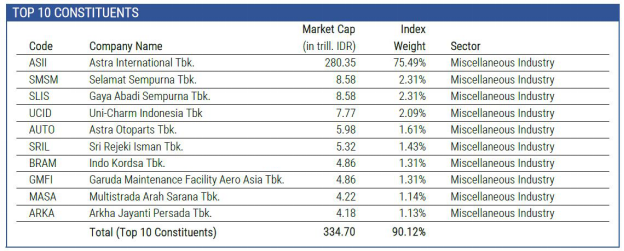 Sektor Industri Lain-lain utamanya terdiri dari industri otomotif dari hulu ke hilir, industry tekstil, popok dan pantyliner sekali pakai dan layanan keramahtamahan penerbangan. Berikut 10 besar perusahaan yang mewakili 90% indeks industry lain-lain;