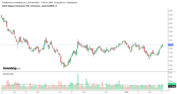 Ini adalah tampilan Heikin Ashi dari saham PT Bank Negara Indonesia Tbk. (BBNI), sedangkan yang dibawah ini adalah Candlestik biasa dari saham yang sama.