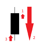 Sebuah candle dapat dianalisis setelah terbentuk sempurna. Candle di atas menandakan bahwa volume jual masih lebih besar dari pada volume beli dicirikan dengan warna candle yang berwarna hitam. Karena aksi jual mendominasi maka harga penutupan berada di bawah harga pembukaan.