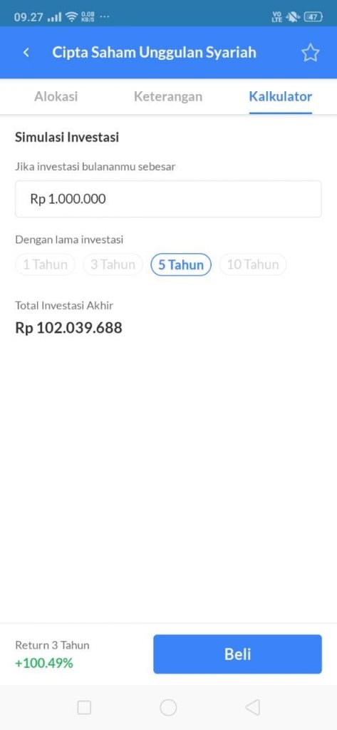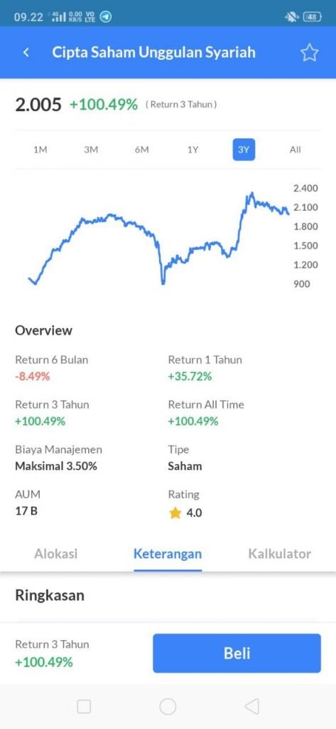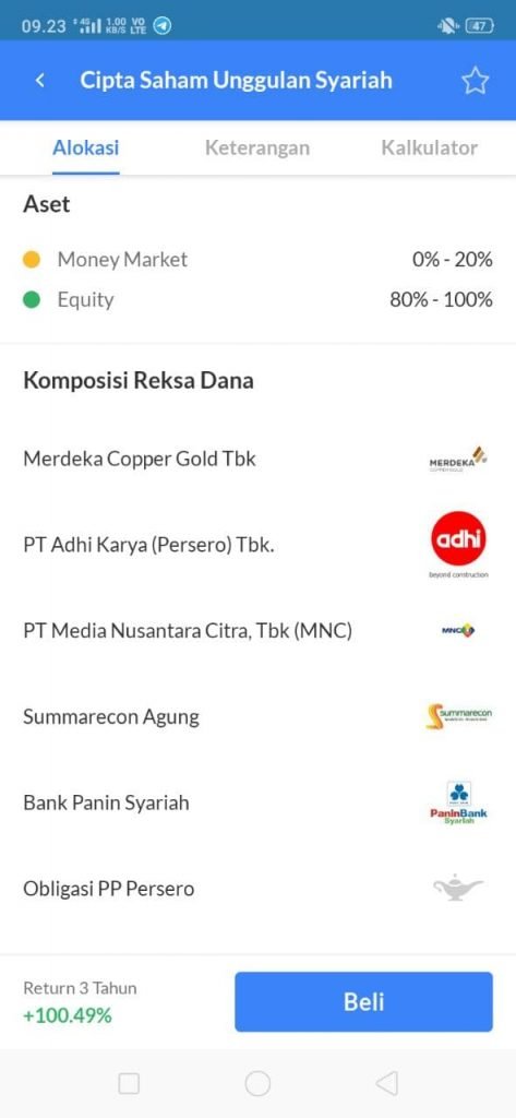 Nah, untuk mendapatkan layanan reksa dana seperti ini bisa dimulai dari Rp 10.000 saja lho. Namun untuk produk yang satu ini, Cipta Saham Unggulan Syariah menerima deposit mulai dari Rp 100.000. Dengan pertumbuhan sebesar 100,49% per tiga tahun maka untuk bisa mencapai tujuan melaksanakan ibadah haji kamu bisa gunakan fitur kalkulator di tab kiri sebelah Keterangan.